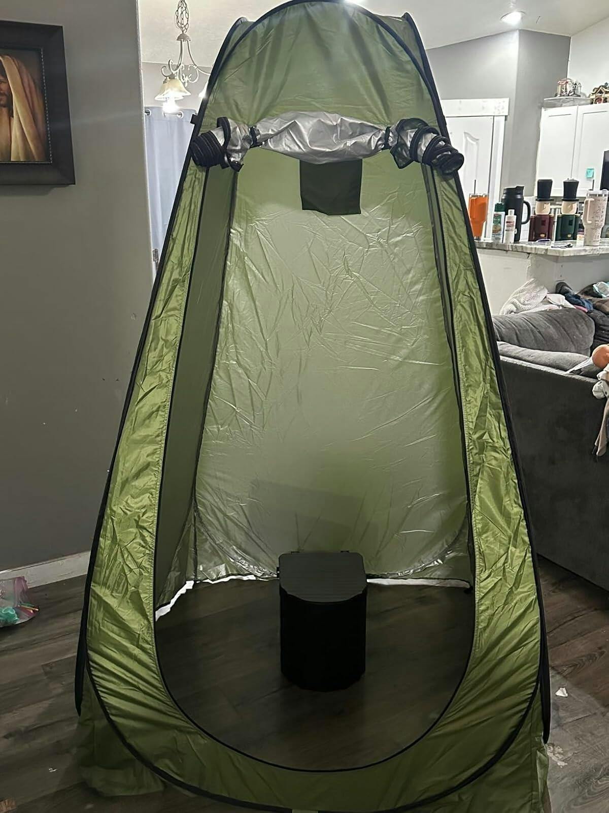Looks to be good quality and is bigger than I expected, which is great! It’s nice and roomy! It also sets up and folds down easily. It’s a lightweight tent material. It has a zipper for privacy and the front flap can also be rolled up and buttoned at the top (as shown in the picture ). Comes with a foldable toilet, toilet paper holder, liners for the toilet, and liquid waste gel. This will be really great to take on our camping trips!